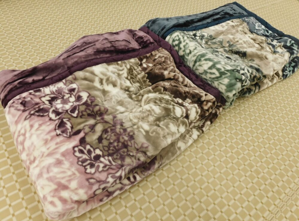 衿付きマイヤー合わせ毛布 両面起毛でふんわり軽くて暖かい。 感触、弾力性、保温性に優れてい…