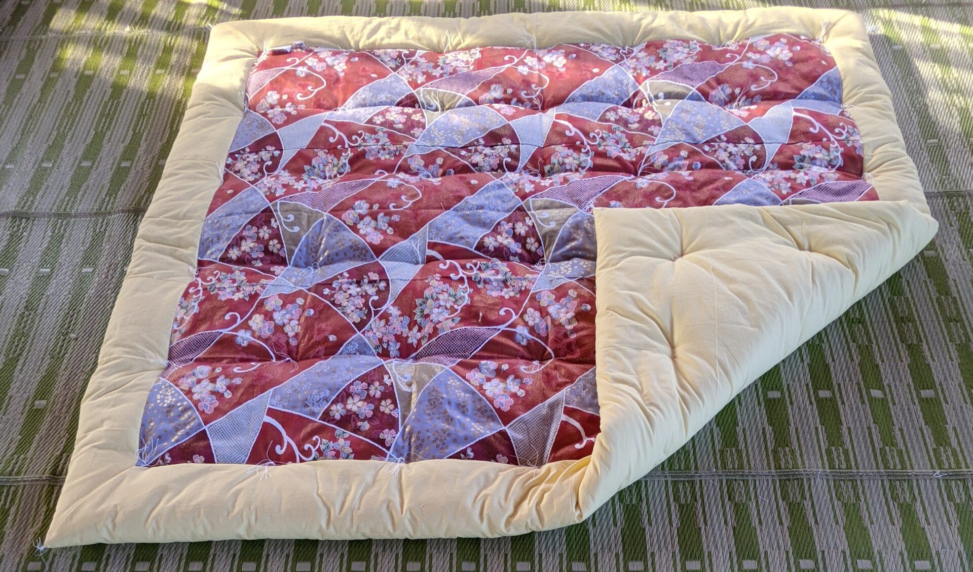 が、綿入れをしてみますと、通常の肌掛ふとんの厚みがありましたので、全部和綴じに変更いたしました。(キルティングを掛けますと、ある程度の厚みがあるおふとんは、馴染むまでパキッとした感じがありますが、和綴じはしなやかです)