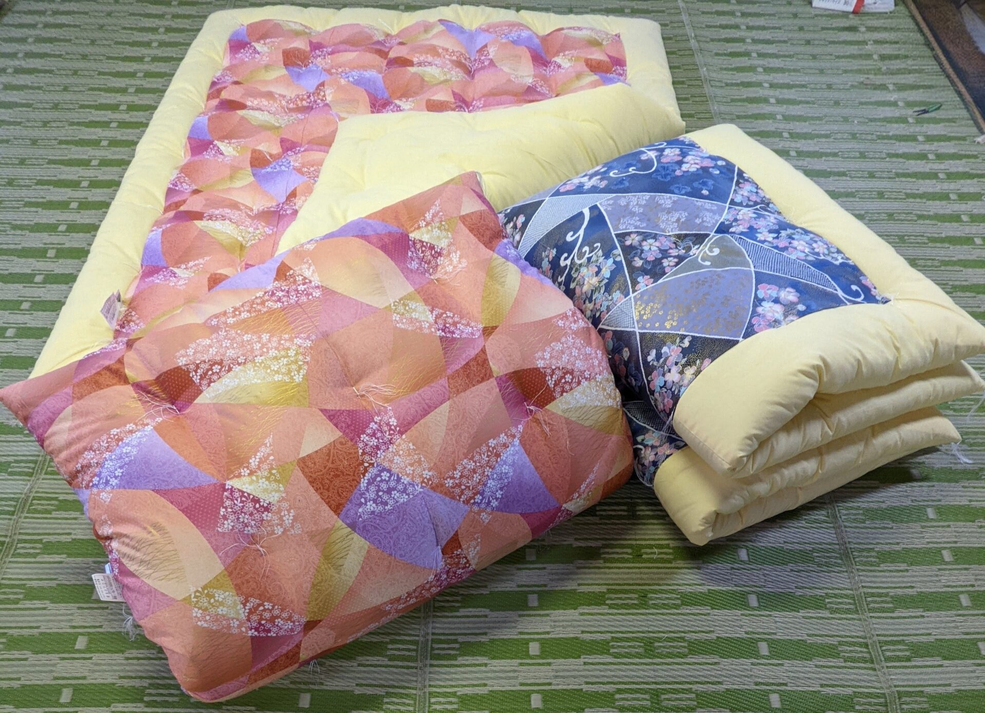 写真は、打ち直しの「シングル敷ふとん」と「セミダブルの掛ふとん(和ふとんのダブル掛ふとん、ともいいます)」と店舗販売用の「150センチ巾のロングサイズ掛ふとん」