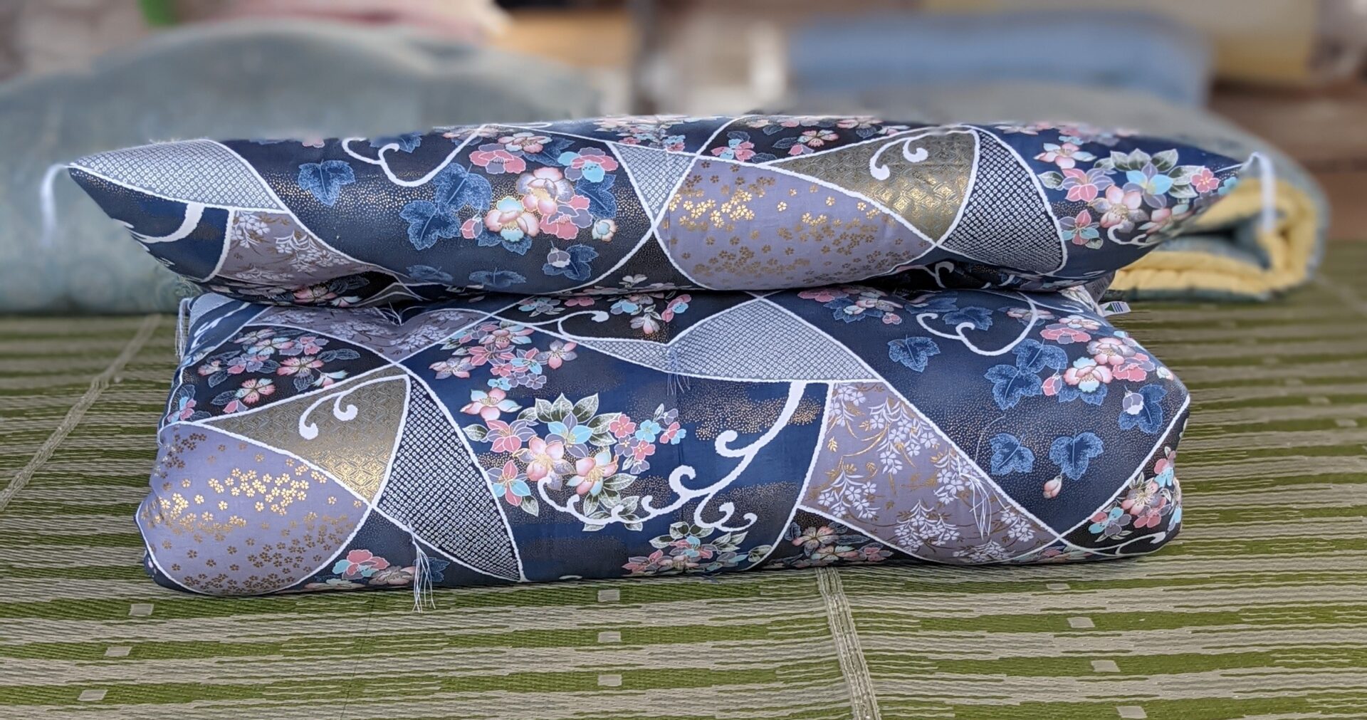 綿サテン「花唐草」のブルーで、敷ふとんと、掛ふとんの打ち直し仕立てをさせていただきました。