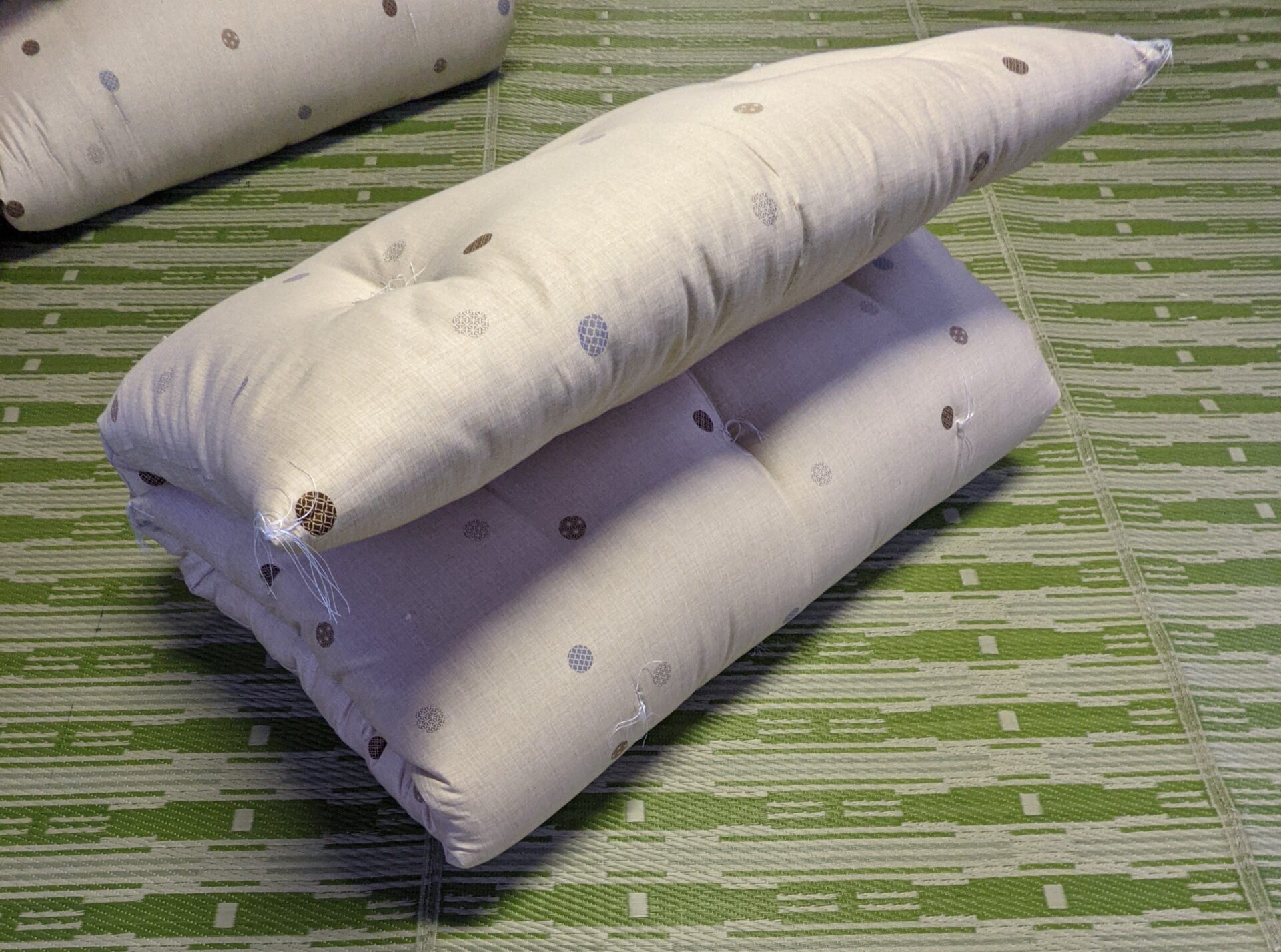 明日競技会です。 寝具は畳敷きの場所で 掛ふとん、敷ふとん、角座布団、円座の順でもめん綿を使い、おふとんを作っていきます。 選手の皆さんには、今夜は「のんびりぐっすり」という訳には…
